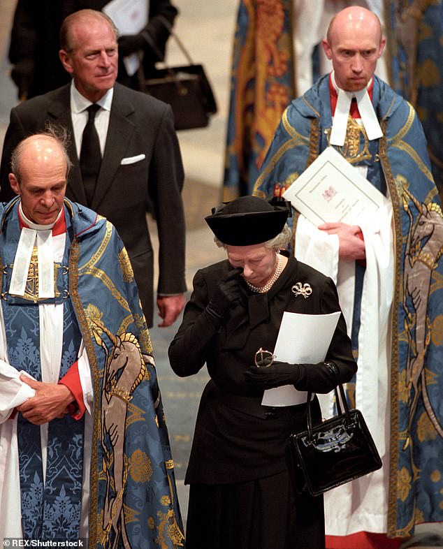 In the days leading up to the funeral, the Queen had faced criticism for not showing emotion. It has been reported that then-prime minister Tony Blair encouraged her to drop her guard. Here, Her Majesty is seen wiping away a tear upon entering Westminster Abbey.