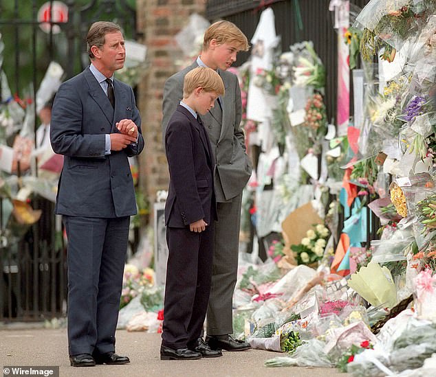 Prince Charles, Prince William and Prince Harry went to meet royal fans outside Kensington Palace on September 5, 1997, after the death of Princess Diana